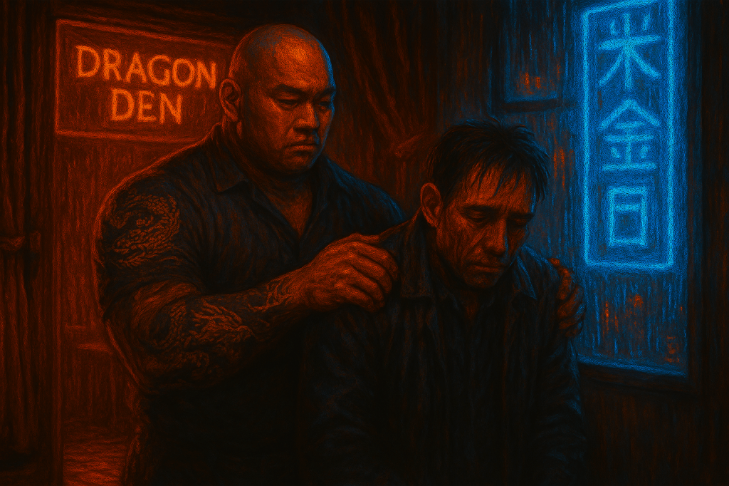 Aoi’s hand, heavy as a slab of granite, settled on Jin’s shoulder. “This way,” he rumbled. Jin allowed himself to be turned, a broken man being led away. He shot one last, fleeting glance over his shoulder at his daughter – a look of part guilt, part futile hope – but Rei didn’t turn her head, her black eyes now meeting Karasu’s, utterly dismissing the man who had sold her. Aoi guided Jin through the smoke and pulsating light, past the glowing bar and the whispering hostesses, toward a plain, reinforced door near the back of the club, far from the main entrance. Jin shuffled, head down. The door opened by Aoi revealed a glimpse of a rain-slicked alley. He ushered Jin through with a firm, final push. The door slammed shut with a heavy, definitive thud that cut off the sound of the city and sealed the fate of Rei Morita.