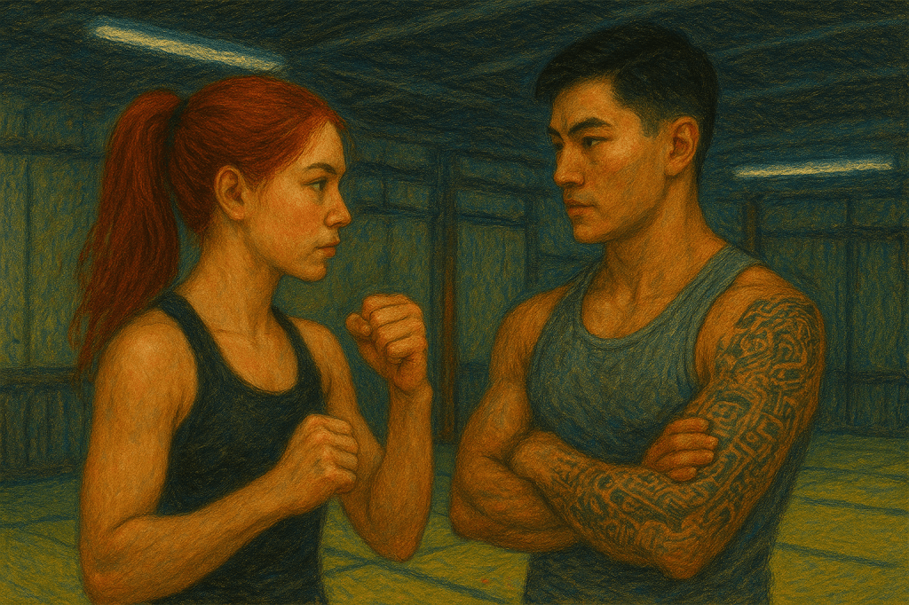 Across from her, Aoto shifted his weight, his own stance relaxed but impeccable. He was four years older, built with the compact, efficient power of a street brawler refined by discipline. He wore a simple grey tank top that showed off arms corded with muscle, scarred knuckles, and a network of faded tattoos that coiled around his left forearm; Japanese Zen-garden patterns mixed with circuit-board motifs, a common style for Chochin. His black hair cut into a classic barber shop side-part and his eyes, dark and serious, tracked her every micro-movement.