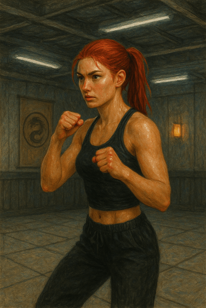 The dojo at the back of The Electric Dragon Den was a world away from the velvet and neon of the main floor. It was a spare, serious room, smelling of old wood, sweat, and faintly of harsh cleaning products. Rei stood in a basic fighting stance, knees bent, hands up. Her body was sheened in a slick layer of sweat, making the new, dark training clothes Karasu had provided stick to her frame. The weeks of proper food had worked a quiet miracle. The sharpness of her malnutrition had softened into a curvy strength. The hollows of her cheeks were less pronounced, and the muscles in her arms and shoulders, once just bone and tendon, now held a defined, yet lush potential. Her red hair, damp with sweat, was tied back in a severe ponytail, highlighting the clean lines of her jaw and the obsidian intensity of her eyes.
