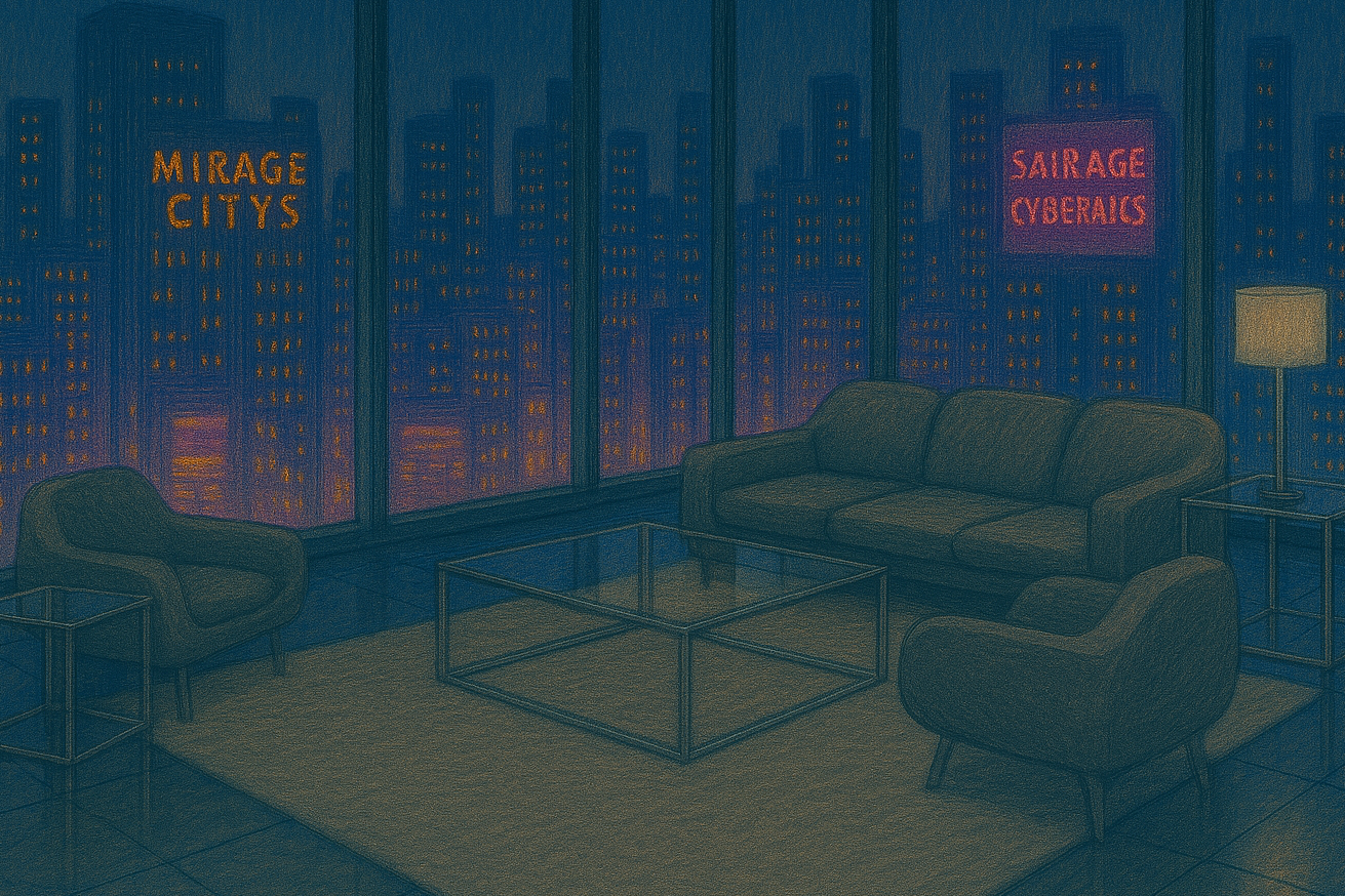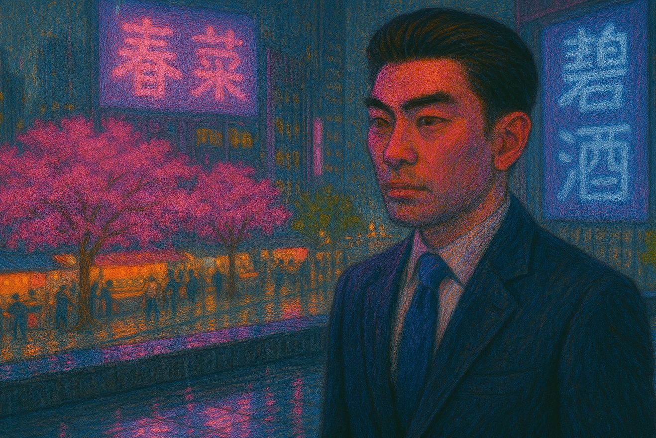 The restaurant’s entrance was a waterfall of holographic cherry blossoms, their pink glow washing over Rei as she adjusted the high collar of her borrowed dress; one of the hostess girls’ spares, sleek black and just expensive enough to blend in. Takumi waited at the bar, fingers drumming against a glass of untouched whiskey. His Kuroda cufflinks caught the light when he turned, spotting her, “You came”. A wide smile lit his handsome features.