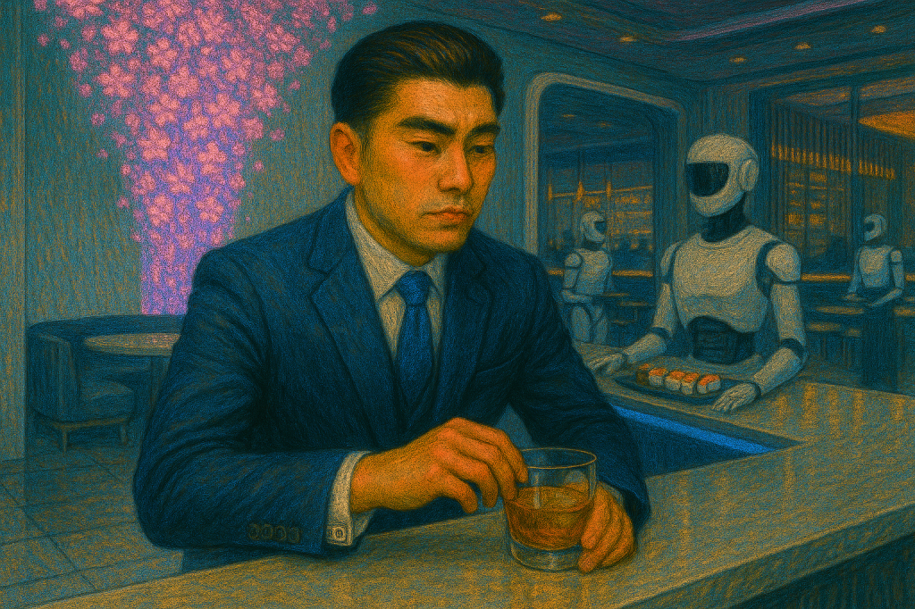 Rei slid onto the stool beside him, “You invited me”, she nodded at the drink, “You’re young for a whiskey man, or are trying something new?” His jaw tightened. The hostesses had drilled her on tells. Too much melted ice in the glass. Fingers tapping on the rim. He didn’t answer and lead her to a nearby table with a reserved sign on. A robotic waiter glided over, offering a menu. Takumi waved it away, “We’ll have the tasting menu. And another whiskey.” Rei smirked, “Confident.” He smirked, “You’re here, aren’t you?”