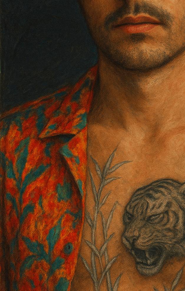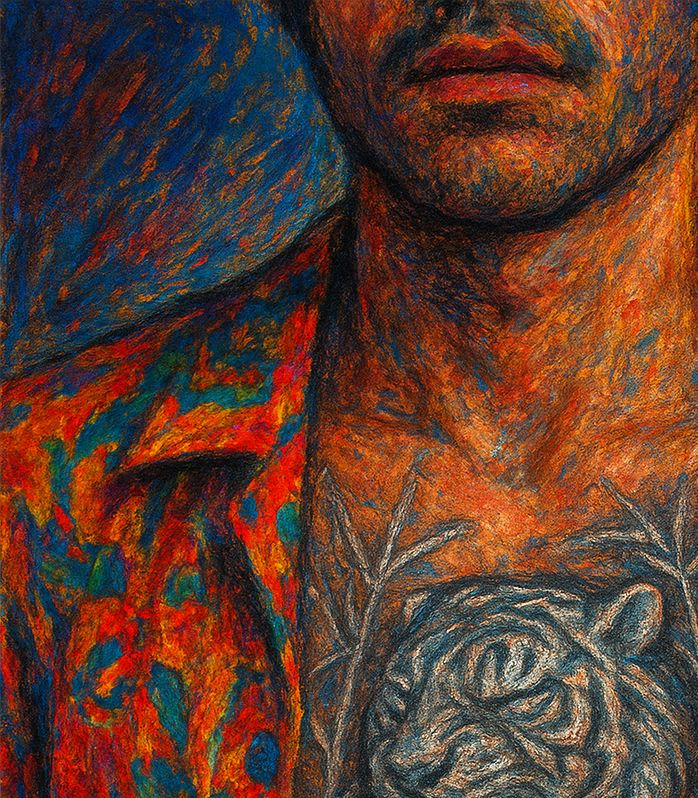 His half-open shirt revealed the ink coiling across his chest: thin stalks of silver bamboo etched like blades of moonlight, and over his heart, the head of a tiger, eyes closed, fangs bared in a silent snarl. Iron Oni. Her stomach dropped. The stories she had heard whispered about the Oni Syndicate, about their pride, their traditions, snapped into chilling clarity. The way this man moved wasn’t arrogance; it was heritage. Violence disguised as elegance.