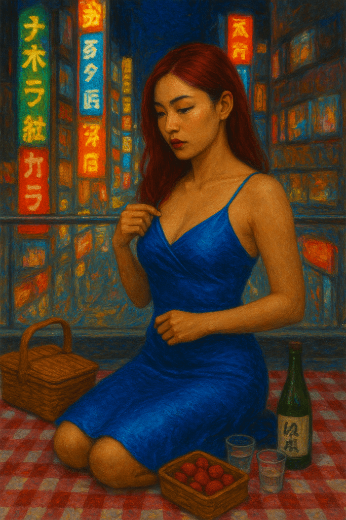 The rooftop of the Sakura Avenues restaurant was deserted that Saturday night, the usual holographic cherry blossoms dimmed to a faint glow. Rei adjusted the strap of her dress; silk, pleaded, the same shade as Karasu’s favorite cigarettes. The picnic basket beside her held real strawberries and a bottle of chilled sake, the same brand she’d seen Karasu drink only on special occasions.
