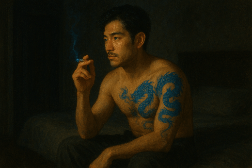 Karasu sat on the edge of his bed, shirtless, wearing loose cotton slacks. The dragons on his torso coiled in the low light. A cigarette dangled from his fingers, its ember casting flickering shadows across the planes of his chest. He didn’t look up as she entered. “You should be asleep,” he said, voice rough. Rei leaned against the doorframe, letting the silk ride up her thigh, “I’m tired of pretending.” That got his attention. His eyes lifted, dark and assessing, tracking her legs, the curve of her neck, the dip of her collarbones, her cleavage. The cigarette stilled between his fingers.