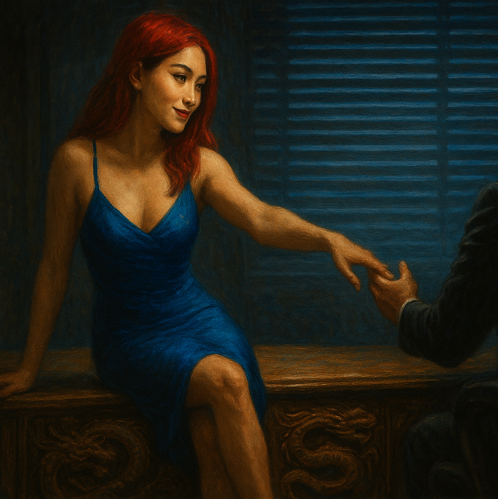 She didn’t bother with formalities. A simple nod and she dropped onto the velvet chair opposite his desk. Karasu’s sharp eyes flicked up, intense and searching. She crossed her legs, and her dress rose up just enough to reveal a faint bruise, one of Takumi’s eager fingerprints. “Takumi Junior’s ours”, she said simply. For a long moment, he just studied her, his gaze darting to her swollen lips for a fraction of a second before commanding, “Tell me.” Rei tilted her head, “Which part?” Jazz from the club below drifted up at filled the silence for a moment.