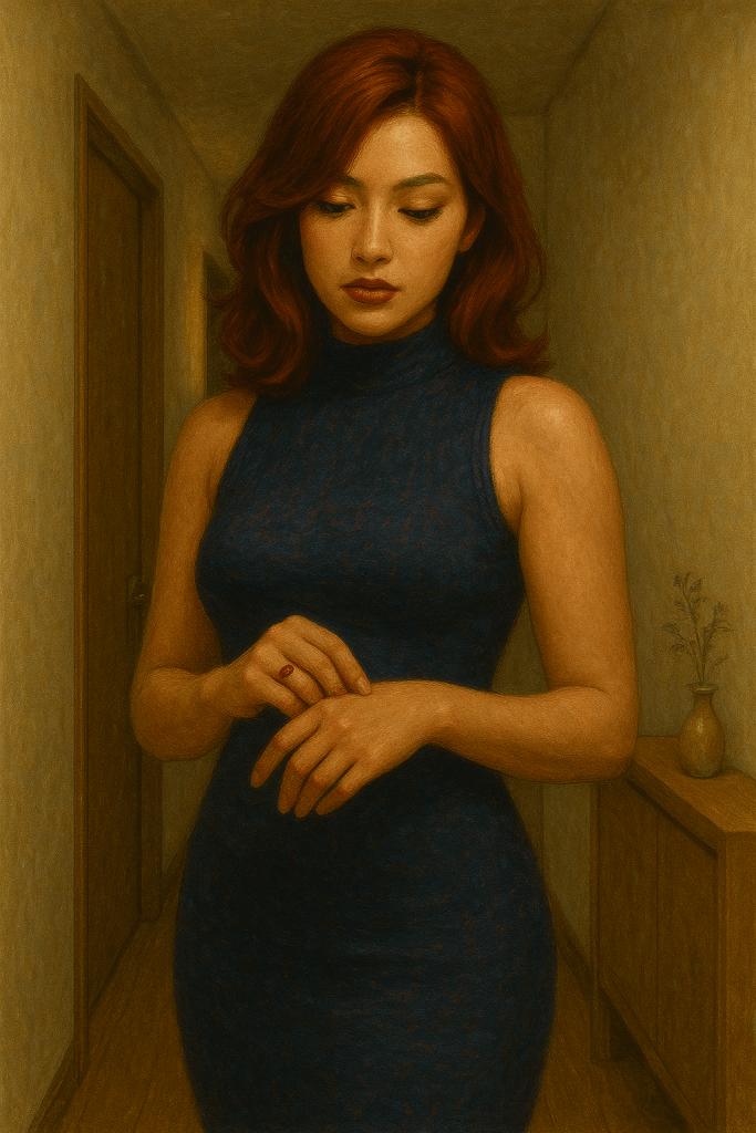 Rei took one last look in the hallway mirror, the woman staring back a stranger of silk, scent and sharp intent. The midnight blue dress clung to her soft as butter, the subtle red threads catching light with every breath. The high neckline felt both regal and restrictive, a constant reminder of the collar around her life. She adjusted the simple red enamel ring on her finger, a final, defiant touch of color. Then she froze, noticing Karasu’s alarm ring still on her other hand. She pulled it half off, hesitated. The thought of the cameras surfacing, but then she slipped it off completely and placed it in her clutch before opening the door.