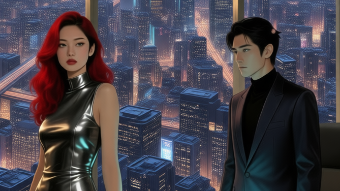 The meeting room was now empty except for Rei and Takumi, the panoramic windows framing Mirage City’s chrome-and-neon twilight horizon behind them. With one flat hand on the desk, Takumi stood concentrated while finishing some notes on his data slate.