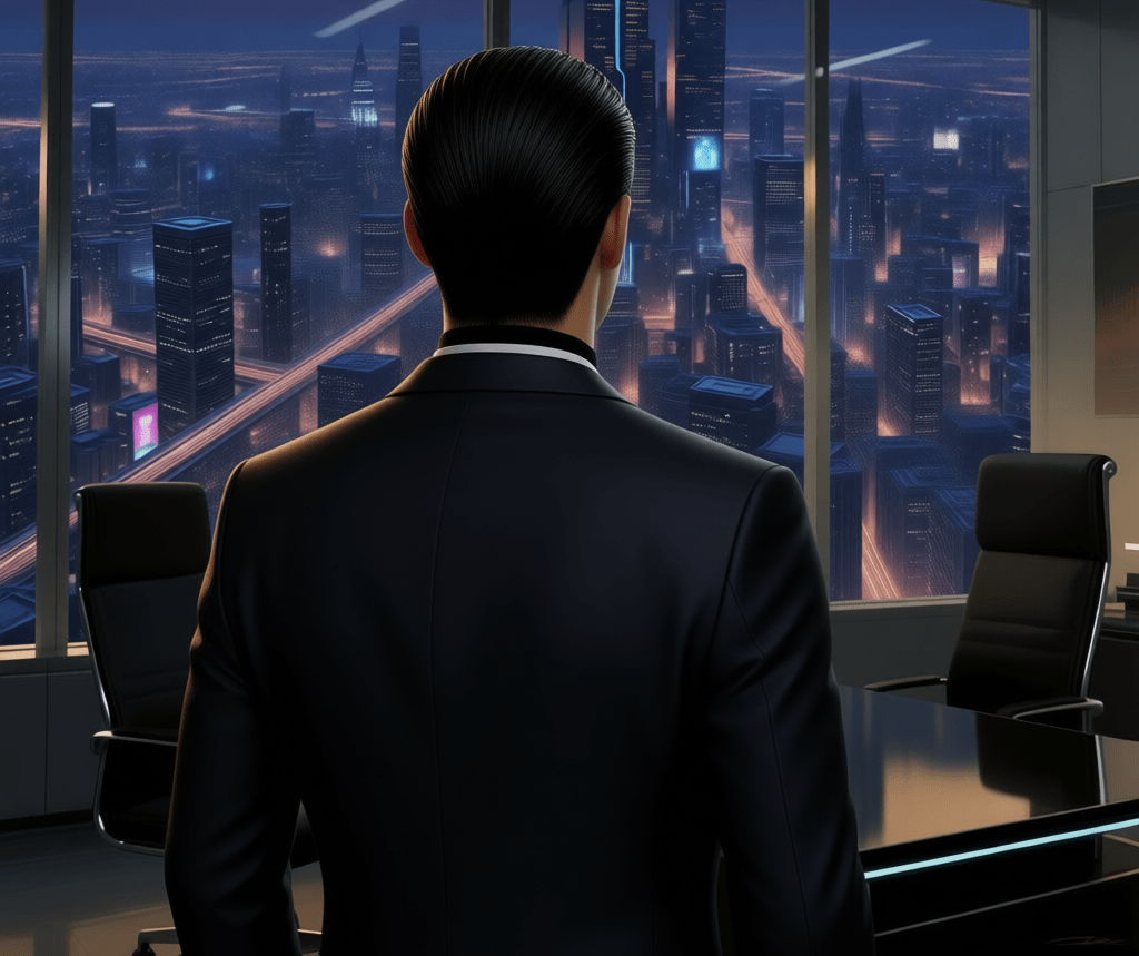 Takumi’s touch loosened, and suddenly she was free. He rose fluidly, as though shaking her off like excess rain. He passed to the low table, scooped up his glass, and drained the Yamazaki in a single swallow. Then, without a word, he turned to the window, hands clasped behind his back, the city’s infinite lights reflected against the flawless line of his suit. He stood like that for several minutes, steadying himself. It was first time he had let his control slip that much. The smiling flirty Eidolon Rei on the promo screen palling in comparison to the real thing like a withered flower.