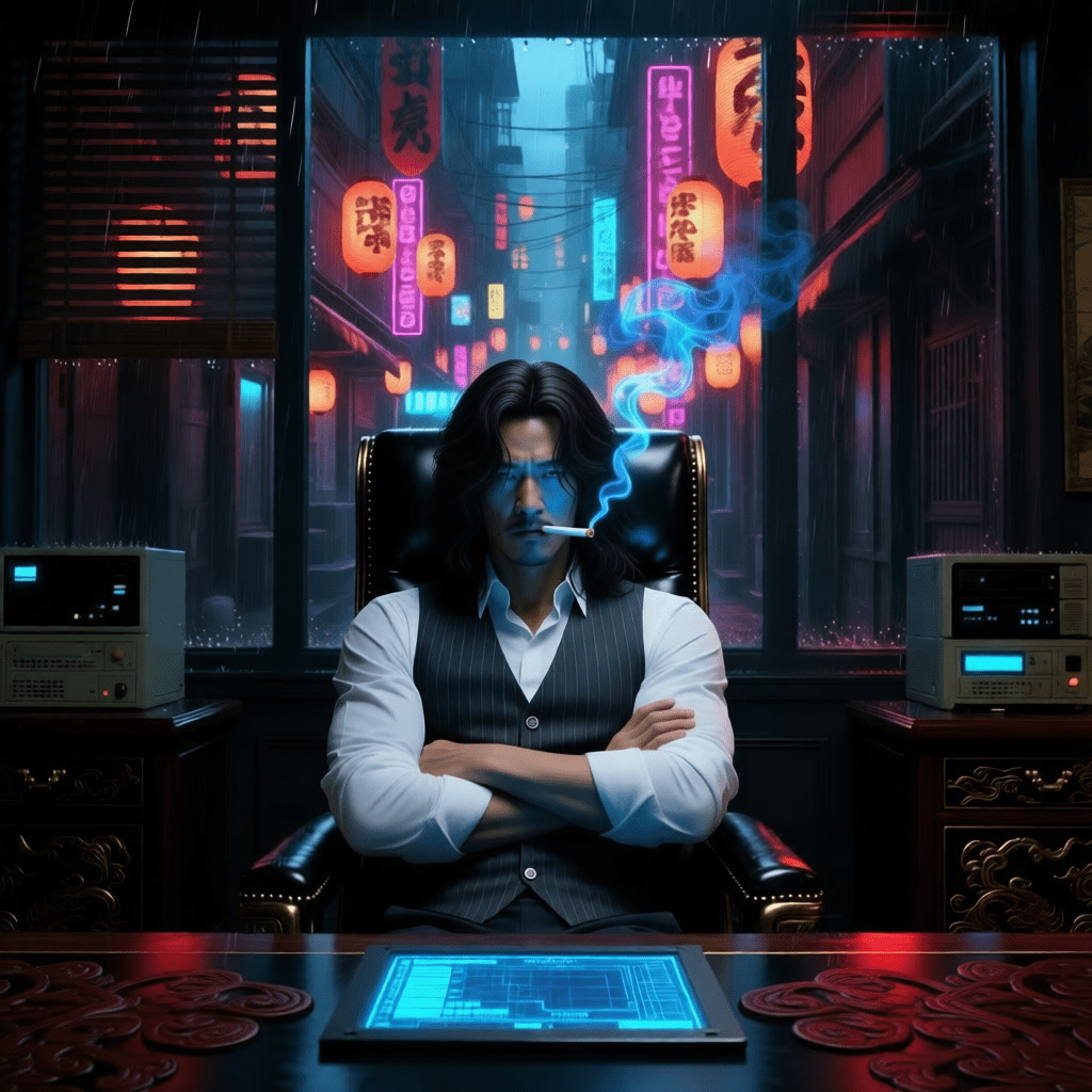 Karasu’s jaw flexed, the faintest tremor of fury breaking through his composure. He turned his gaze toward the window, Chochin sprawled beyond it, flickering in blues and reds, pulsing like circuitry, “He took her body. Now he wants her soul too.” He rose, pacing once, twice, the scent of smoke following him. “Keep watching their servers,” he said quietly, “If they push a public version of Eidolon, I want to know the second it goes live. And Aoi—”