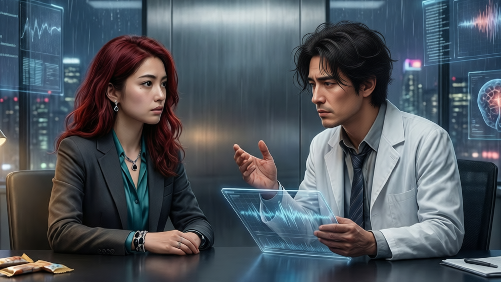 It became a ritual for them to meet Wednesdays after work hours. This evening the air in Dr. Kaoru Sato’s lab was, as always, cool and humming with the latent energy of a dozen active processors. Rei entered to find him in his natural state: perched before a bank of monitors, his slight frame coiled with nervous energy, unruly hair falling into his eyes as he flicked through data streams.
