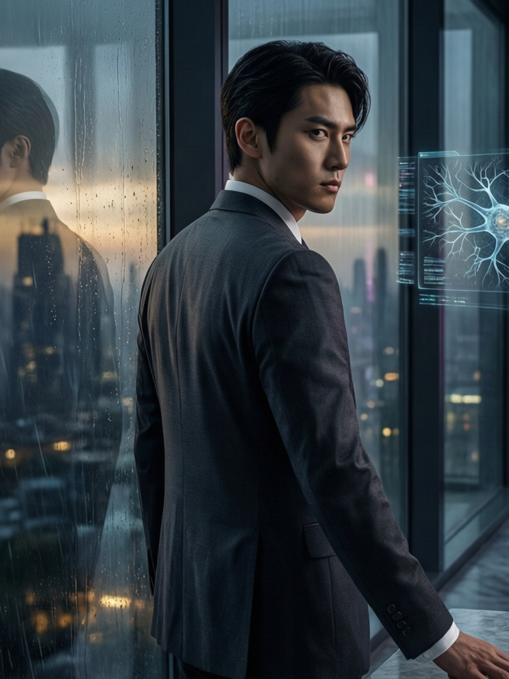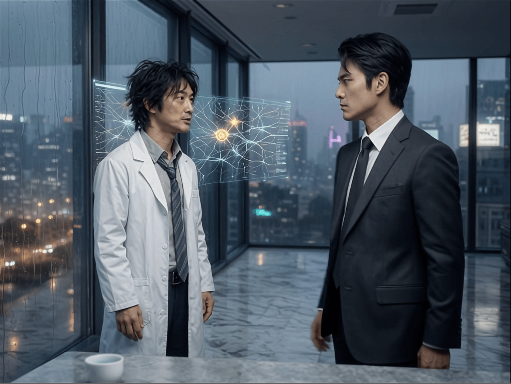 The Kuroda Plaza office was silent but for the faint hum of traffic bleeding through the glass. Mirage’s holographic cityscape sprawled below in perfect, shimmering consistency, a tapestry of rain-smeared neon. The evening light had gone violet, bleeding into the deep black of night. Takumi stood before it, a silhouette cut from expensive wool and controlled ambition, a half-empty glass of chilled sake in his hand. Behind him, the door hissed open and shut. The frantic, skittering energy of Doctor Kaoru Sato entered the room before he did, a cloud of nervous possibility. Takumi didn’t turn.