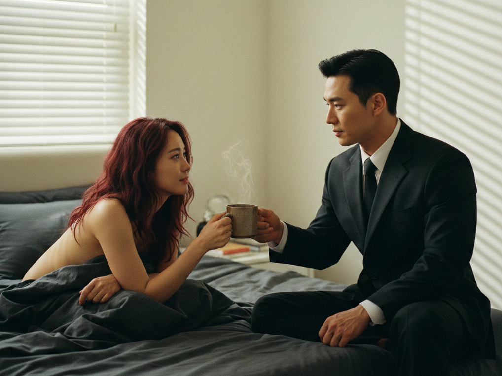 The first thing Rei registered was the rich, aromatic scent of coffee, cutting through the hazy warmth of sleep. She blinked her eyes open to find Shoma, already fully dressed in his sharp security detail suit, sitting on the edge of the bed. He held a steaming mug out to her. “Dawn patrol,” he declared, his voice a low, morning rumble, “I have to get going.”