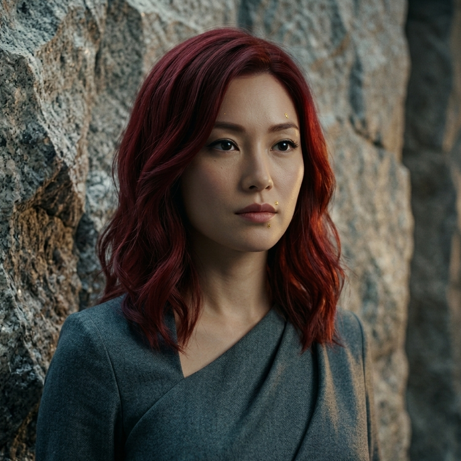 Before Bjorn could pry further, the lab door opened and Rei stepped out. The change was subtle yet profound. The new golden marks above her eyebrow and beside her lip caught the simulated sunlight, transforming her elegance into something bolder, more regal. She looked almost like a modern Cleopatra, her beauty now edged with a metallic highlight.
