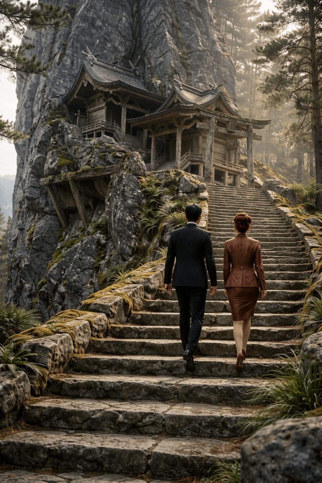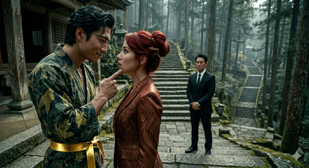 Gradually, Rei calmed, drawing strength from his unexpected embrace, using his steady presence to fortify her own resolve. When she straightened, she met his eyes with a bittersweet yet brave smile. The car glided to a silent halt. Cillian opened the door, revealing their destination: a serene, ancient-looking Japanese stone stairway with a shrine at the end of it, burrowed deep in a grove of whispering pine trees, a world away from the corporate war they were eventually to re-enter.