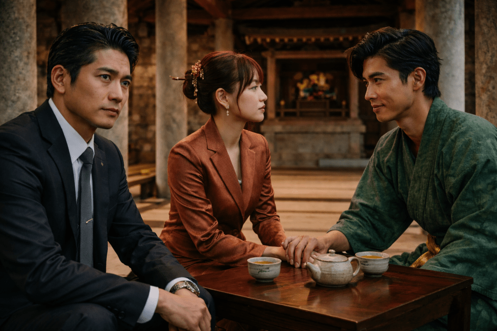 Rei cleared her throat, forcing her voice to remain level, “May I… ask clarifying questions? About the current ritual… about the way you seem to be holding it?” Reon finished his tea and pushed the empty cup toward her. “Pour us tea,” he instructed. As she moved to obey, her mind raced behind the mask of perfect grace. She lifted the pot, refilling his cup, then Takumi’s.